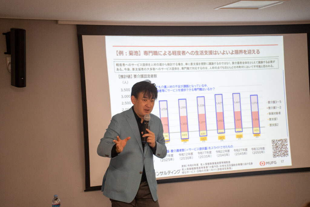 7日目は、三菱UFJリサーチ&コンサルティング株式会社 社会政策部の「岩名礼介」主席研究員を講師に招き、「超高齢社会の地域ビジネスの可能性」と題した講義で、天草市・群馬県桐生市・愛知県蒲郡市の3塾での合同講義形式で開催。天草市は現地開催で、桐生市と蒲郡市はオンラインで受講。